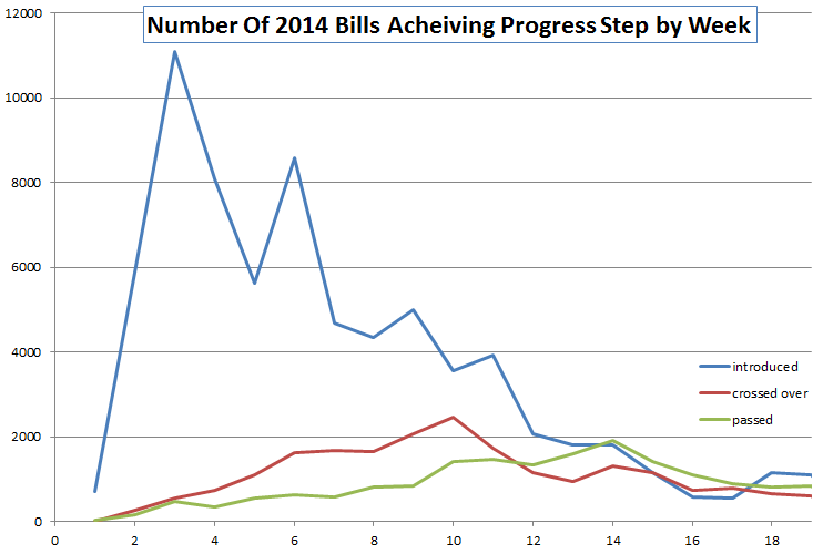 As you can see introductions peak in late January (with a secondary peak in February when several states start their sessions) and drops off sharply afterwards, crossing over peaks in mid March, and passing bills peaks in mid April, although there is still sustained activity for weeks afterwards