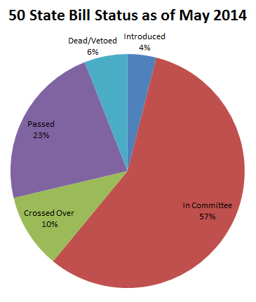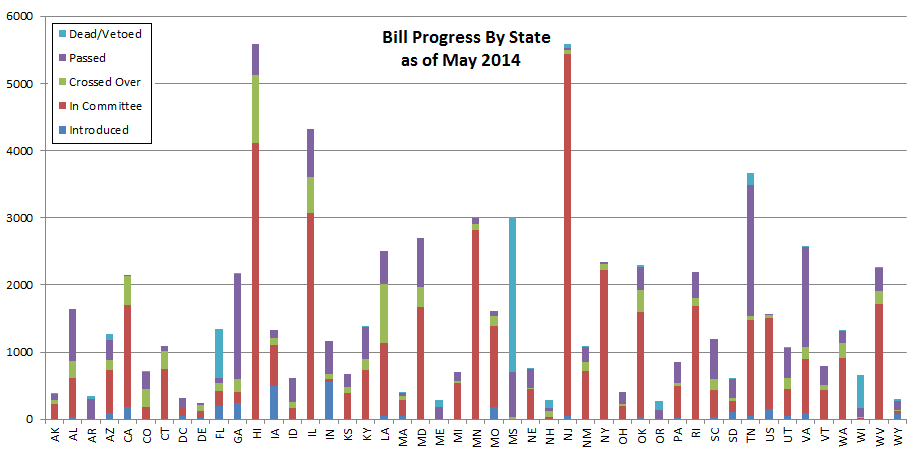 To celebrate rolling out our newest feature, filtering by bill progress, we are taking a look at bill progress across the states. The following analysis is about bills introduced since the beginning of 2014 through now (May 2014). Note MT, ND, NV, and TX are out of session this year, and NC has not started it’s session yet. They are not included in this analysis. First, let’s take a look at the overall picture, across all states in session, the US Congress, and DC: