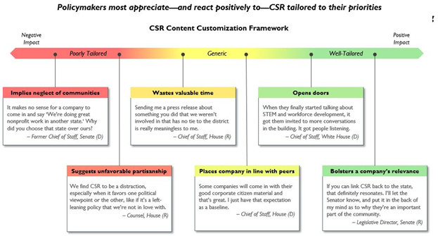 Organizations invest millions of dollars each year in philanthropic work to bolster their standing as strong corporate citizens, but these efforts often do not always translate to a policymaker audience. Simply donating to charitable causes is not enough to create strong policymaker perceptions of an organization’s Corporate Social Responsibility (CSR). Policymakers have come to expect charitable giving from all corporations, such that organizations do not stand out on these activities alone.