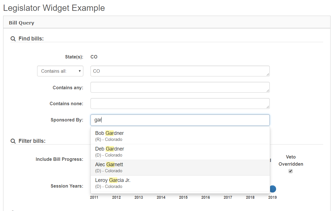 If you would like to create a widget to display all bills introduced by a specific legislator(s), there are two basic approaches. For an example see any state legislator page on Ballotpedia, like the one for Alec Garnett.