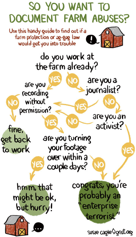 This flowchart comically shows how someone could be impacted by Ag-Gag bills based on the context of their work and intentions.