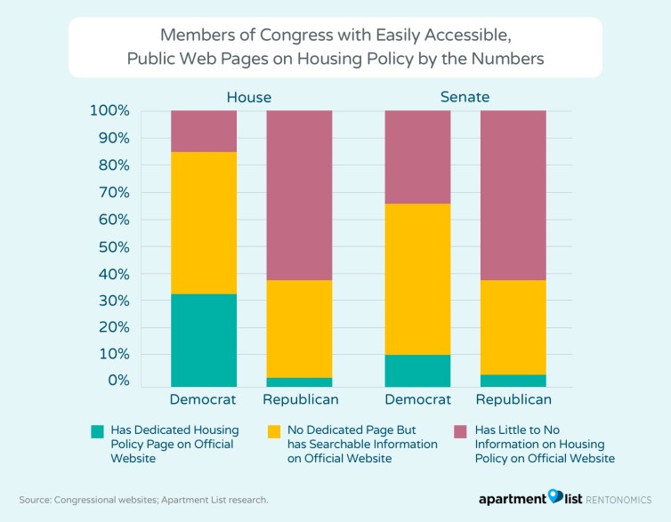 After analyzing Congressional websites, researchers discovered that only 14% of lawmakers have a dedicated housing issues page, and 42% have little to nothing easily accessible to the public. 70% of Congressmen and Congresswomen who are taking the most tangible action on housing policy are members of the Congressional Black Caucus, Congressional Hispanic Caucus, or the Congressional Asian Pacific American Caucus.