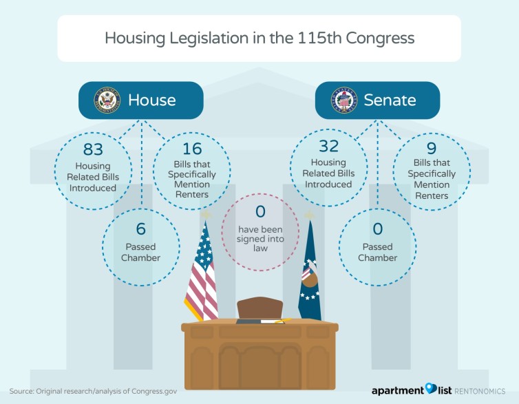 The few housing bills that are introduced by lawmakers are mostly geared towards helping those that own, exacerbating the issue of viability for those in the rental market. This trend can be seen in the 115th Congress in out of the 83 bills that the House and 32 in the Senate, only 25 specifically mentioned supporting renters (16 in the House and 9 in the Senate).