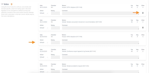 The display in the vote section may vary from state to state depending on the data we are able to process and provide. By default only the most recent vote in each chamber is included in your final score. The calculator icon indicates which votes are being included.