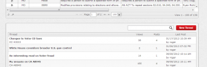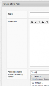 If you have permission you’ll see a new thread button to start a new thread. The tools to create a post are normal. One thing I want to point out is the box to add associated bills. This box works the same way as the search by bill number box on the query tab. Type the two letter state abbreviation (US for federal), and then a space, and then pause and let the drop down box populate. Choose the bill you would like to attach to this topic. You can repeat the process and add as many bills as you like.
