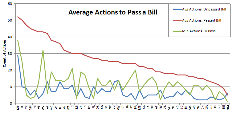 Here’s a look at the minimum number of actions it takes to pass a bill, and also how many actions, on average, it takes to pass a bill. I also added with the average actions of an unpassed bill for comparison. You’ll see the states vary widely, but usually there’s a big gap between the average number of actions for a bill that passed vs one that didn’t. Except in New Mexico, which is an oddity.