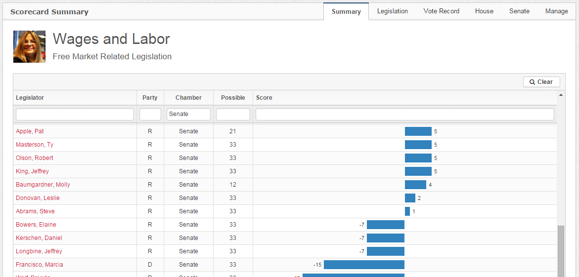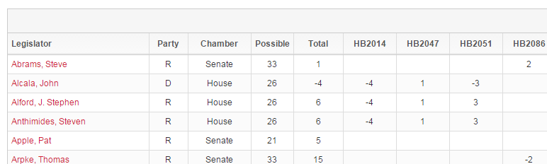 The first tab shows an overall summary of the legislator scores. You can click on any column to sort by that column. You can also use the filter button to narrow by party, chamber, or score range (for example, you can enter “<0” in the score filter to see only legislators who have negative total scores).