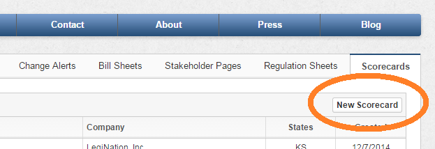You will be asked to choose a state (or choose United State for Congress). Scorecards can only be for a single state (or Congress). If you would like to keep an eye on several statehouses you will need to make separate scorecards for each. You then step through the usual purchase process; an unlimited number scorecards are $500/year if you already have a BillTrack50 legislation subscription.