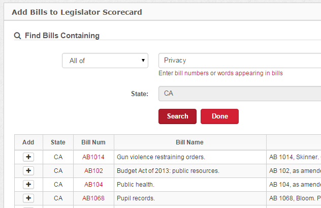 You can go back and add new bills to your scorecard at any time. Simply go to the scorecard tab, choose the scorecard you want to add bills to, and go to the legislation tab. You’ll see an add bills button, which will bring you back to this search screen.