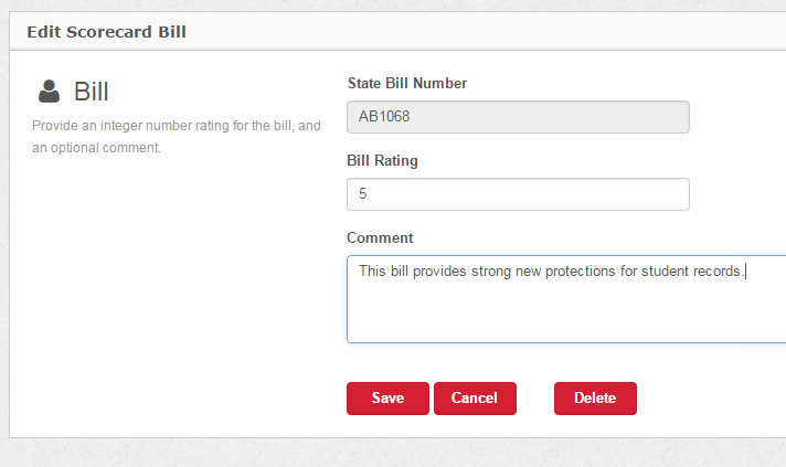 The third and final step is to rate your bills. When you first add bills to your bill sheet they will have a default rating of 0. Click the edit button next to the bill you would like to rate and you’ll be taken to the rating screen
