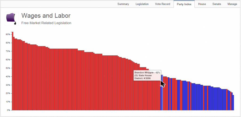 The party index tab shows a ranking of who agrees and disagrees with you most, color coded by party. You can hover over any bar to see which legislator is being represented by that bar.