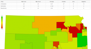 Finally the House and Senate tabs show some statistics broken out by party, as well as a heat map of which parts of the state agree and disagree with your agenda. This example is from Kansas: