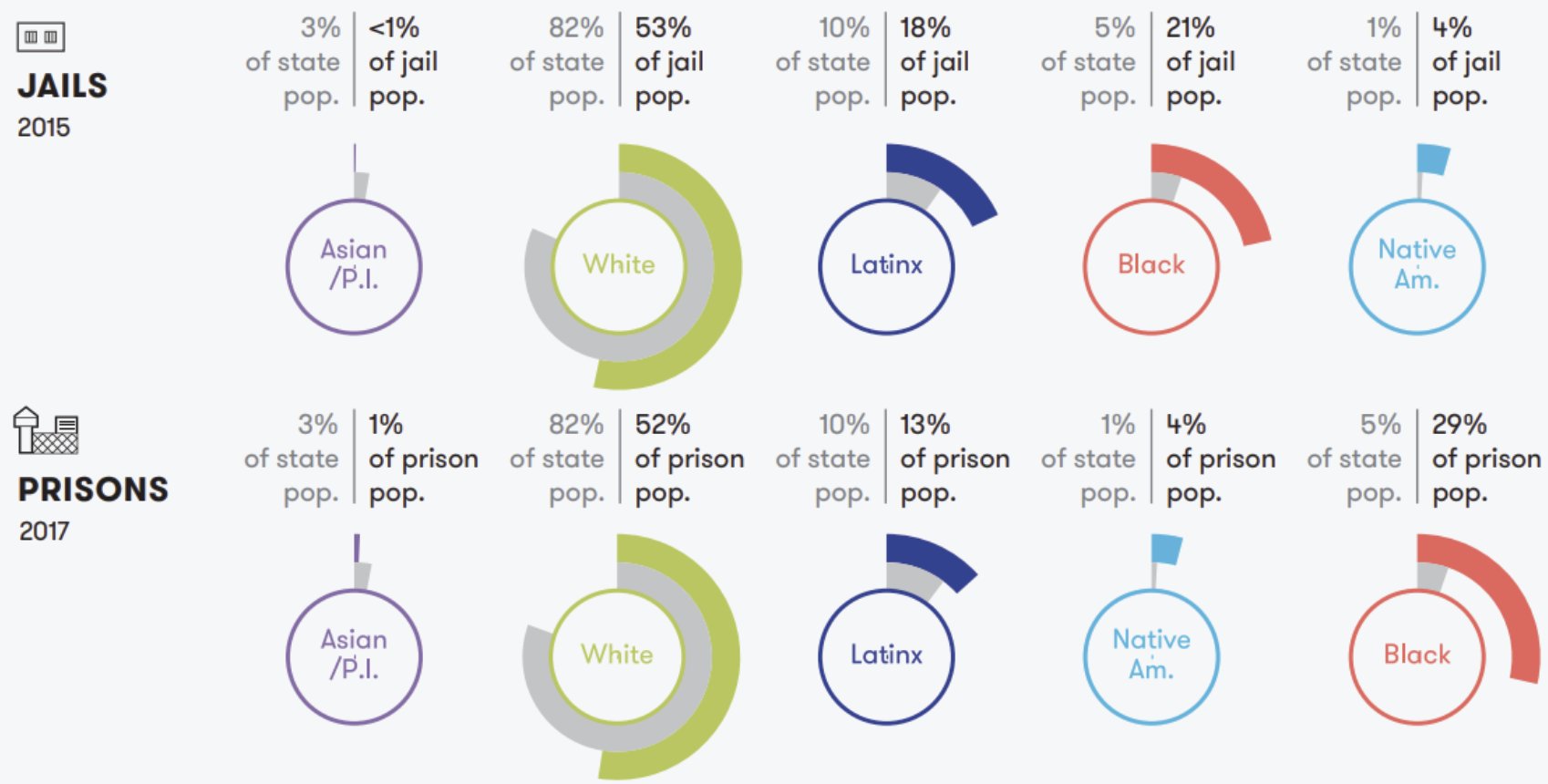 People of color are disproportionately incarcerated throughout the United States at an alarming percentage, it is no different for Nebraska. According to the Vera Institute of Justice, Nebraska incarcerated Black people at 8.2 times the rate of white people, and Native American people at 6.9 times the rate of white people in 2017. The following graphs are of incarceration rates broken down according to data available in 2017 for prisons and jails.