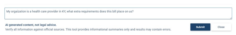 And HelpBot has a friend! On every bill page there is now an Ask AI button, which lets you provide a custom prompt for the AI to analyze the bill, for example to see what the specific impact will be for your organization. Read this post for more details.