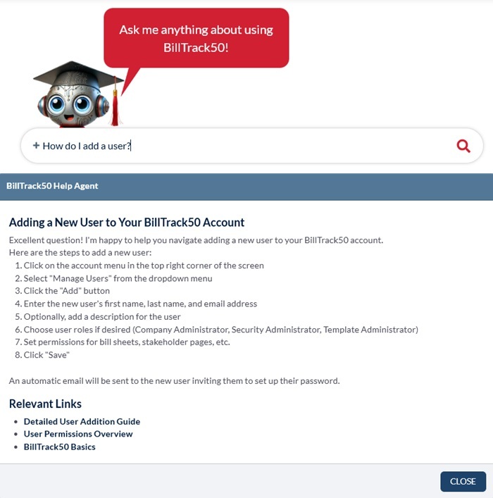Our very comprehensive help center was enhanced in 2025 by the addition of an AI powered helpbot. You can now ask questions about any aspect of using BillTrack50, and the friendly bot will explain the steps and provide useful links to help posts.