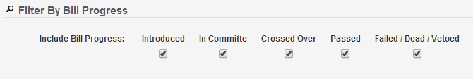 We have added a new way to filter bills on your bill sheet, based on their current progress through the legislative process. We are just taking a very high level view of the steps, so you can look for just bills that have at least made it to the second chamber, or all bills that haven’t passed yet, or exclude bills that are dead, etc.