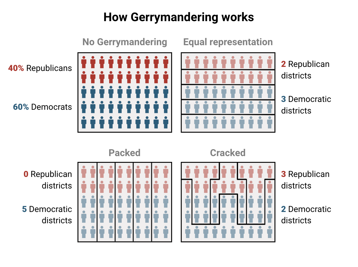 Gerrymandering is the practice of drawing political districts in a way which gives one party a skewed advantage over the other in elections. The quality and relevance of representation and policies enacted by legislators and how they align with community values are affected by district boundaries. Party advantage can be manipulated by “cleverly” drawing districts. Legislators use two main strategies to gerrymander districts: packing and cracking. Packing is when lines are drawn in a way that places as many members from one party as possible into one district, thus allowing the other party to win the rest of the districts. Cracking essentially does the opposite, drawing lines which split a single group across multiple districts in a way that diminishes their power even if they have the majority. Here is a great image from Business Insider illustrating the two most common methods of gerrymandering.