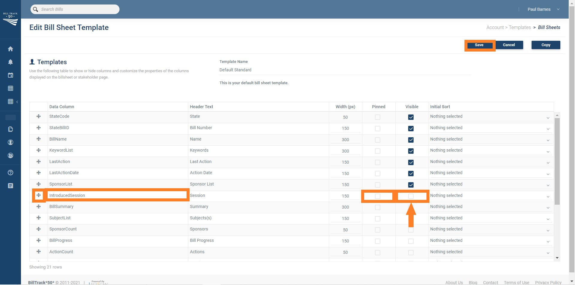 The column that we are looking for is "Introduced Session". Once you have located "Introduced Session", check the box in the "Visible" column, this will make introduced session appear on any bill sheets using this template.