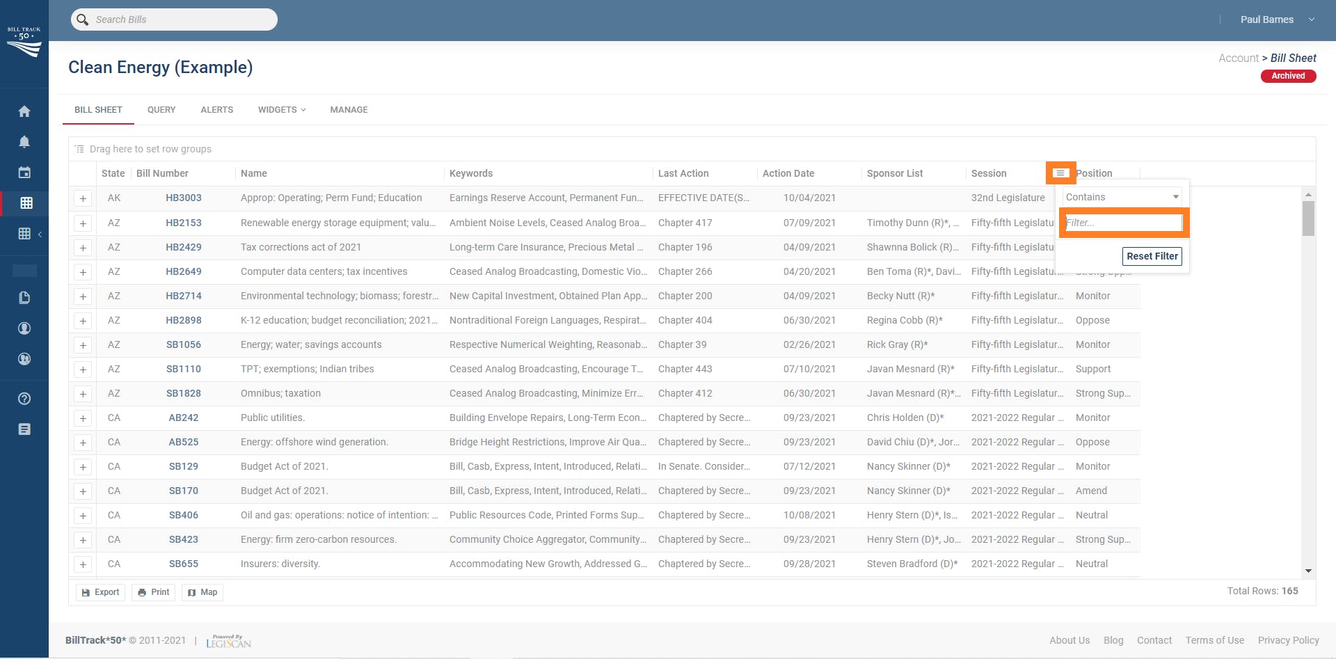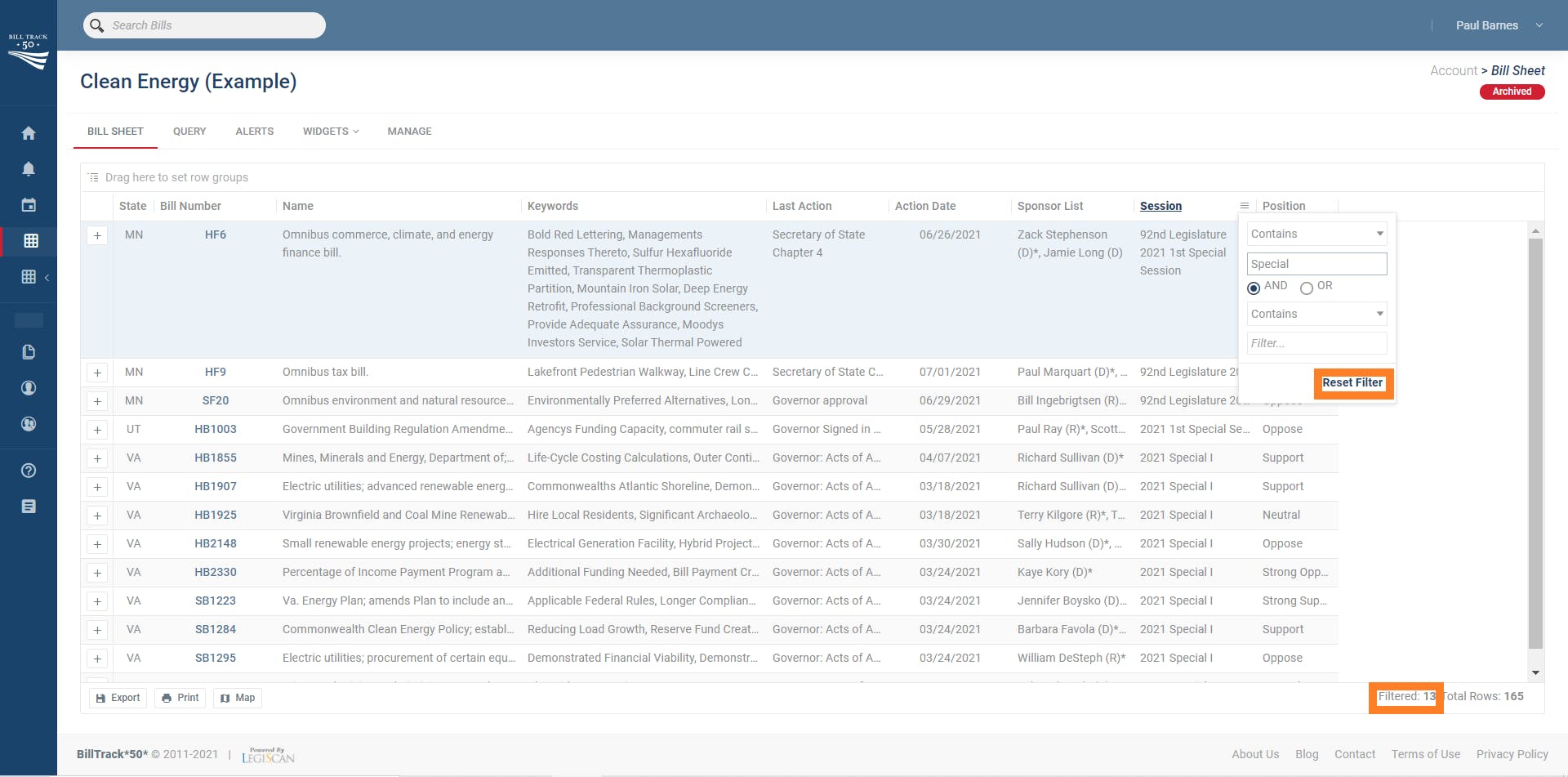 This will filter the bill sheet for only bills that appeared in sessions that have the word "Special" in their name, which naturally will filter the bill sheet to only show you bills that are from special sessions! Notice that the count of filtered bills is shown in the bottom right corner.