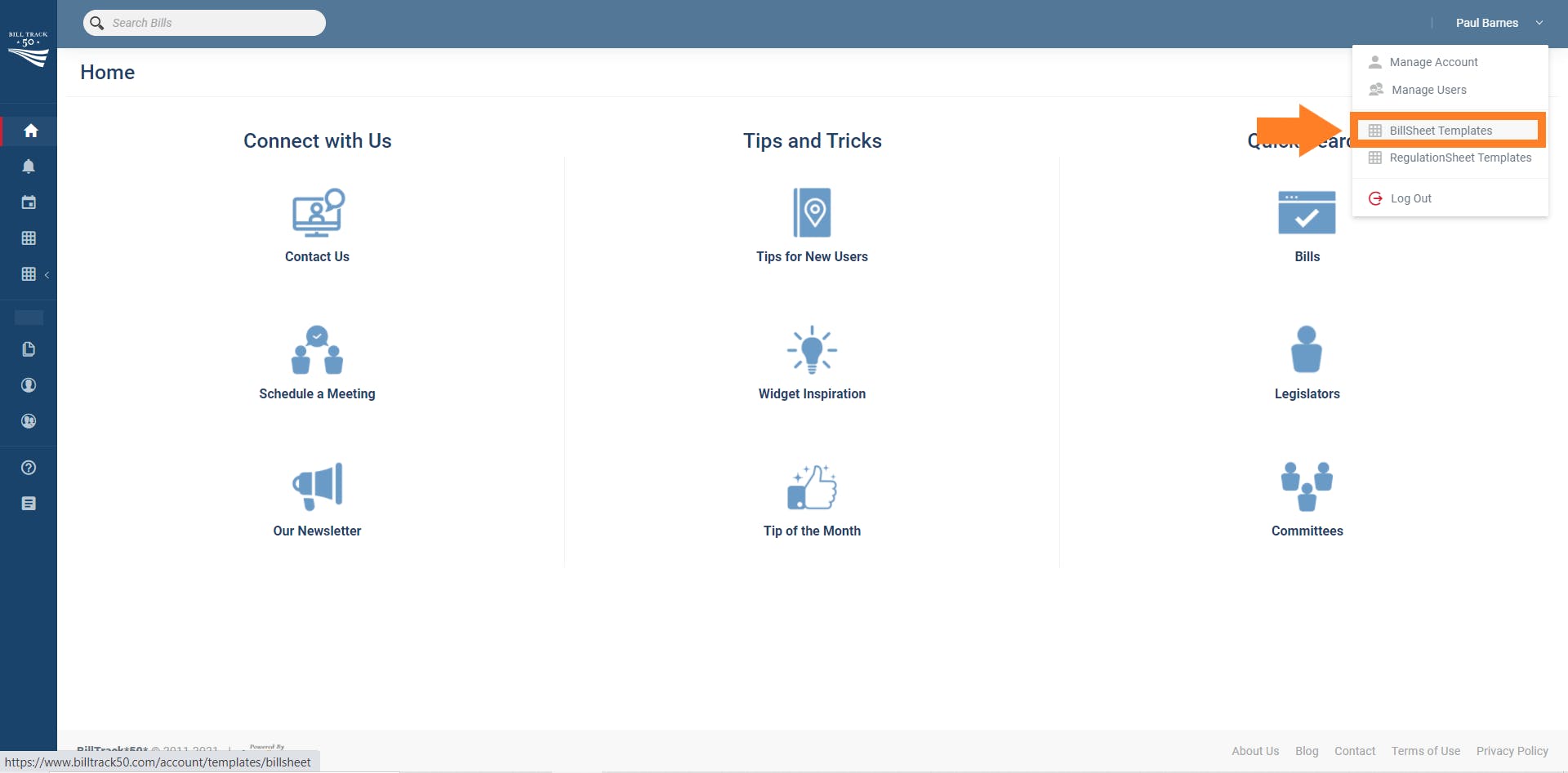 The first step is to modify your bill sheet's template. You can do this by clicking on your name in the top right corner, which will open up a dropdown menu. Then click "Bill Sheet Templates". If you do not see this as an option, then you don't have permission, and will need to ask your company administrator to do this instead.