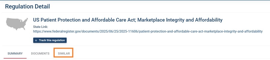 Next, I sorted the State column alphabetically. After reviewing 19 notices across six states, I discovered the “Similar” tab on the Regulation Detail page (see below).