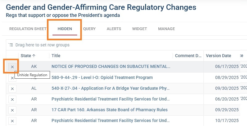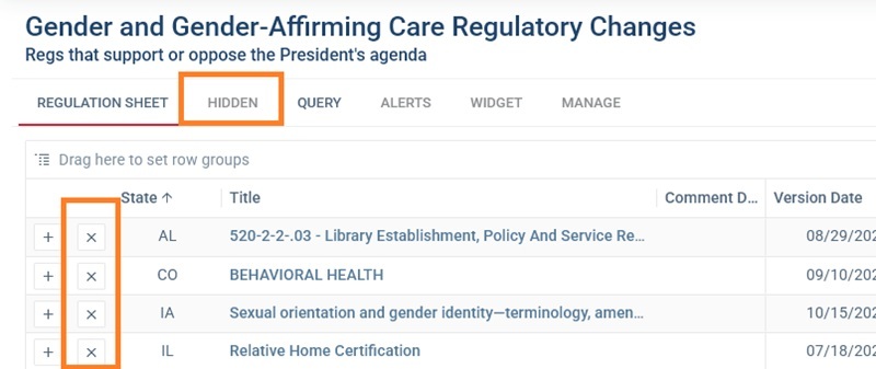 If you accidentally hide a notice, open the Hidden tab and click the ‘x’ next to the regulation to return it to your sheet.