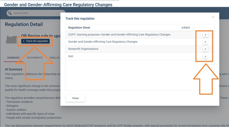 During my review, I found that most relevant federal regulatory notices were already included in my results. However, I also identified additional relevant state notices that were not previously identified. When you find a relevant regulation, click “+ Track this regulation,” then select the “+” next to regulation sheet where you are adding the regulation. A date next to the ‘+’ indicates that notice is already being tracked.