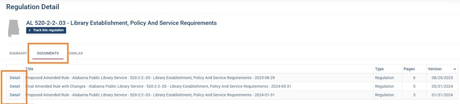 You should be able to track each regulation from proposed changes to finalized rules, or at least to the current status of the regulatory change. In many cases, all relevant documents appear on the Regulation Detail page (see image above where “Detail” is highlighted). Sometimes, multiple rows represent different stages of the same regulation.