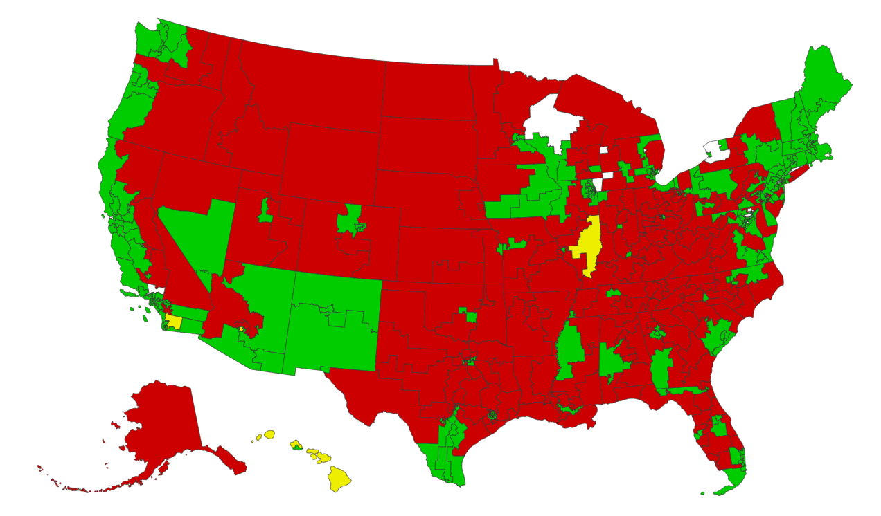 Here is how the vote on agreeing to H.Res. 767 looked by district (green = yes, red = no, yellow = didn’t vote, white = empty seat)