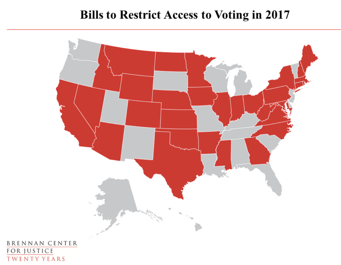 According to the Brennan Center, in 2017, at least 99 bills were proposed perceived to restrict access to registration and voting in 31 states. Of these bills, 35 bills saw significant legislative action (meaning they have at least been approved at the committee level or beyond) in 17 states. The laws ranged from voter ID laws to vote roll purges to changing requirements for voter registration.
