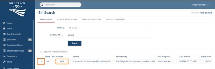 On the Quick Search screen, or in the search box at the top, type in the number of the bill you are searching for, with no space between the letters and numbers of the bill, and then type enter or click search. Bill numbers need to match the state format, for example some states us “H” or “HB” to designate house bills, some use “A” or “AB” because they have an Assembly. If you can’t find your bill try adding (or removing) a B to HB or SB. You can also see this list for more details on bill number format.