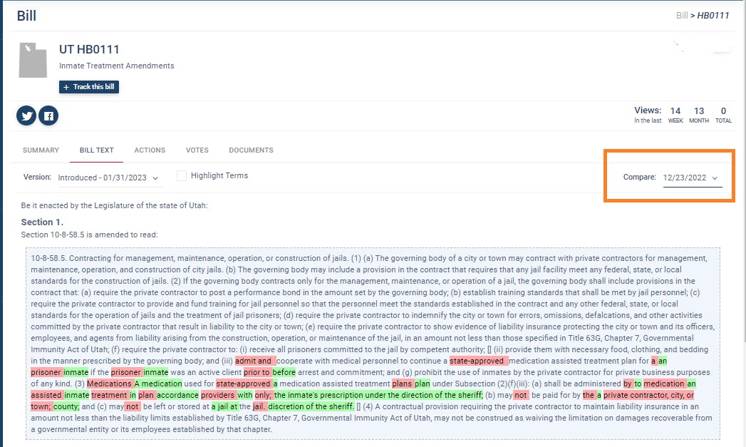 The Last Amended Date column will let you know the last time a new version of the bill was posted on the state legislature website. This date will align with your version alert, if you have version alerts set. You can use this column to identify bills that have been modified and may need a second review. Remember that you can compare two versions of a bill by using the "compare" drop down on the bill text tab when you are looking at a bill. This will highlight in red what text has been removed between bills, and highlight in green what text is new.