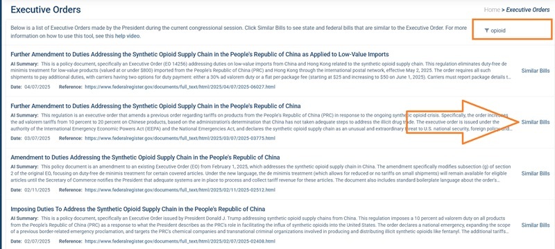 You can see a list of related bills from Congress and the states by clicking Similar Bills on the right of a particular order. The AI will return bills that are on a similar topic, they may not be written in direct response to the executive order.