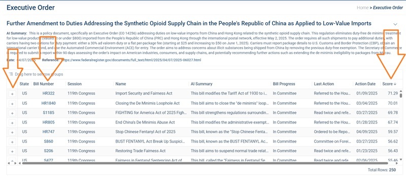 It will always return 250 bills, though not all will be relevant. As with our other similar bills features, there is a score column to the right which shows how similar the AI thinks the bill is to the executive order. Bills are displayed in order, with the most relevant on top. The grid shows familiar information, including an AI summary of the bill. Clicking the bill number will take you to the bill page for more details on the bill. And you can add the bill to any of your bill sheets (if you have a subscription) by clicking the + symbol to the left.