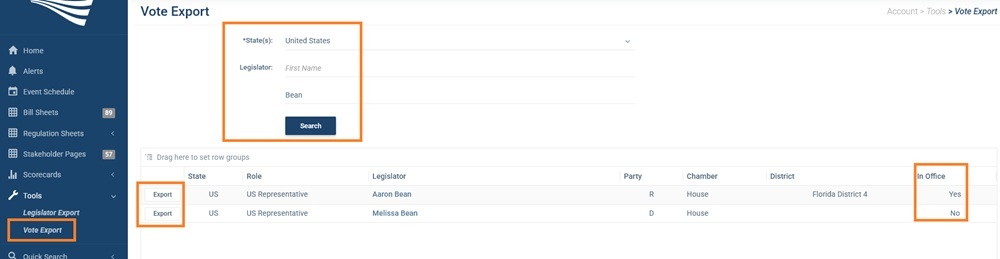 Interested in exporting a legislator's votes? You can find their most recent votes under the Vote tab on their legislator profile.
