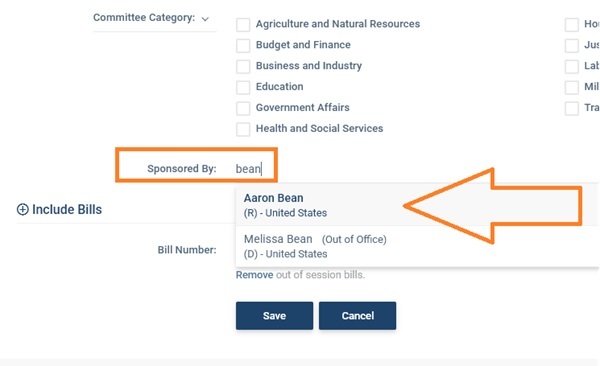 On the Query tab choose the state (choose United States for Congress), and click the Save button at the bottom. You have to save before moving to the next step because the Legislator, Committee, and Bill Number filters don't work until the system knows which state(s) to display. After choosing a state and clicking Save, go back to the Query tab and choose the legislator in the Sponsored By section of the query filter. To choose the legislator, start typing their name and then select the name when it appears in the drop-down menu.