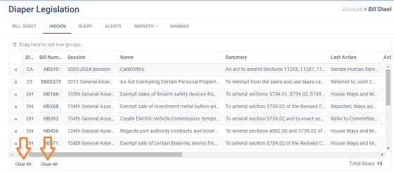 The hidden tab also offers you an easy way to manage your hidden bills and remove old bills from the hidden list that are no longer relevant. The "Clean All" button will remove any bill that no longer matches your query - probably because it doesn't match your current date range but maybe you changed your search terms or state coverage. Be careful though, the "Clear All" button will clear ALL the hidden bills. So click carefully!