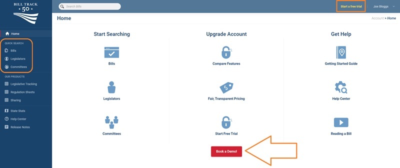 As a free user, you can only use the QUICK SEARCH functions on the left to search for bills, legislators and committees in current legislative sessions. If you want to track or share legislation, or see historical bills, you will need to purchase a subscription. You can start a no-obligation free trial of our paid services from the home page, and you can also book a demo where we can show you our products and help you choose the right subscription.
