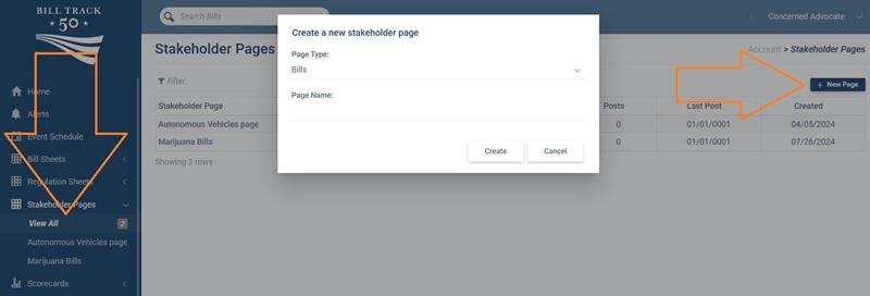 IMPORTANT NOTE: Stakeholder pages are based on an underlying bill or regulation sheet, if you do not have a sheet set up then you’ll need to create one before you start the process of creating a stakeholder page.