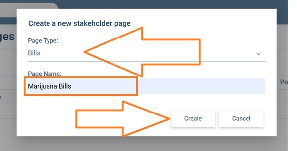 Step 2. Configure required items. Once you have clicked on the “New Sheet” button a pop-up will appear. For the first item choose whether you want create a stakeholder page based on a bill sheet or one based on a regulation sheet. For the second item enter a name for your new Stakeholder Page (you can change the name anytime later). Then click the “Create” button.