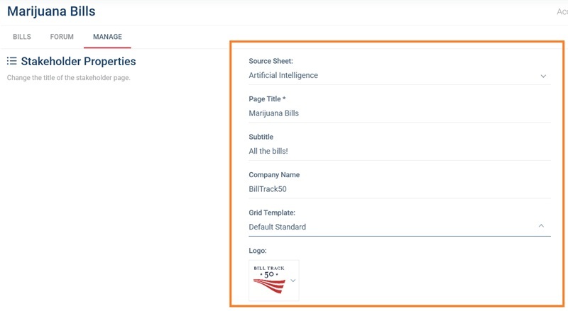 Step 3. Configure optional items. After clicking create you will be taken to the Manage tab of your new Stakeholder Page to make any adjustments you might need. You also have access to two other tabs: the “Forum” tab, which is a basic discussion forum (more info in Step 5 below) and the “Stakeholder Page” tab where you can view the bills (more info in Step 6 below).