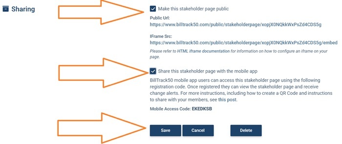 - Share this Stakeholder Page With The Mobile App: Checking this box will give you a mobile access code. You can give the registration code to anyone, and they can use it on the Billtrack50 mobile app to see the Stakeholder page. People following your Page on their mobile device can choose to get daily alerts on the status of the bills. For more information on how the mobile pages work see this post.