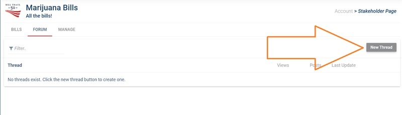 Step 5. Using the Forum (optional). Click on the “Forum” tab at the top to go to the forum page. Here you will see a list of all of the threads your stakeholders have started. To start a new thread you (or they) can click on “New Thread” in the top right corner. To view an existing thread simply click on that thread in the list.