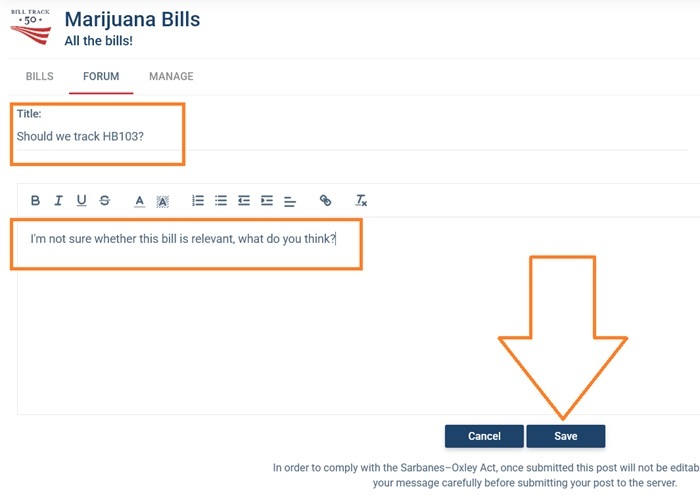 When shared within BillTrack50, the stakeholder pages include an optional discussion forum where your users can leave comments and other information, like a tiny legislative slack. This forum can be a great tool to solicit opinions and feedback from stakeholders and subject matter experts and organize relevant information all in one place.
