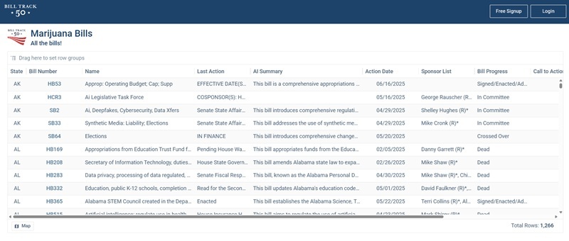 If shared publicly, visitors can sort, filter, and read bills via the bill detail link to get more information without needing their own BillTrack50 account. To see regulations, they will need to have a BillTrack50 free or paid account. They can also interact with any custom information you have chosen to include in the grid.