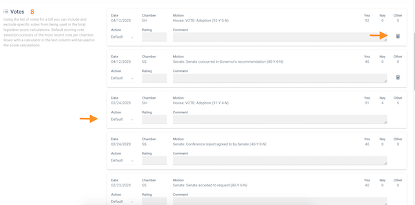 The display in the vote section may vary from state to state depending on the data we are able to process and provide. By default only the most recent vote in each chamber is included in your final score. The calculator icon indicates which votes are being included.