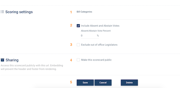 If you chose to import your bills from a bill sheet and include a position column, your scorecard will use your entries in the position column to set default scores. (See section 0) Getting Your Account Ready above for a breakdown of the default scores.) You can choose the edit this default bill to adjust those scores and go through each vote to decide if it should be included or should have a different score.
