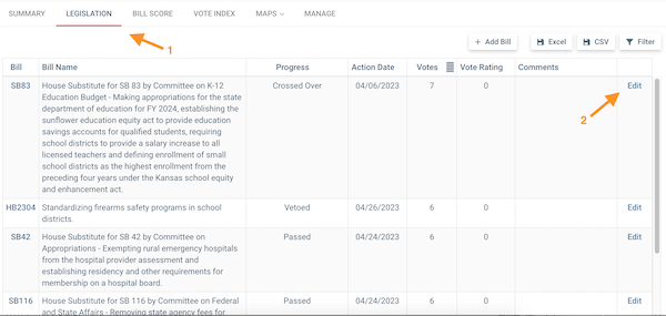 Once you have added the bills you want to the Legislation Tab, you can start working through your list bill by bill to score your bills. To start click the "Edit" link on the far right of the bill row to begin scoring.
