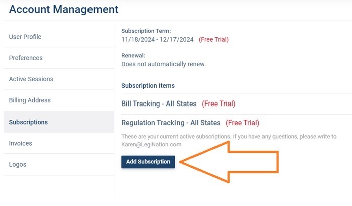 This will take you to the subscriptions section of the account menu. It will show your currently active subscriptions (in Joe's case, a free trial) and the possible subscription items (bill and regulation tracking). It also shows that Joe currently does not have his account set to auto renew subscriptions. Click Add Subscription to proceed.