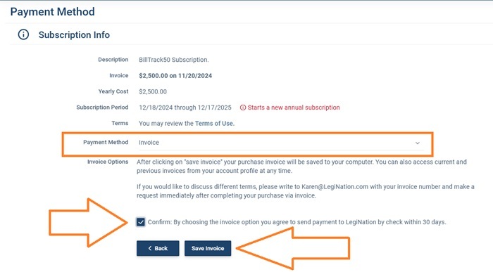 If you choose to pay by invoice, auto renew and monthly payments are not available. You will need to check the box confirming that you will make payment within 30 days. Then click Save Invoice and the invoice will be downloaded to your computer and will also be saved in the Invoices section of the account management menu. You can pay your invoice by check, credit card or ACH. If you need the ACH details or a W9, or you wish to pay using a different method, then please contact us.